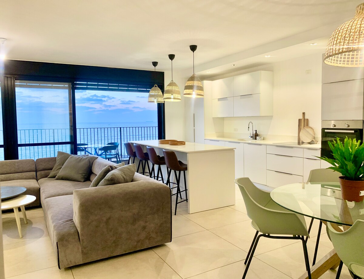 A brand new luxury beach-front apartment with a fantastic sea view from the house as well as from the master bed room . house is fully equipped with modern amenities. The balcony is spoiling and large. The location is right at the beach close to Cafe place, Pizza bar, grocery shopping and a shopping mall. There is also a synagogue at the building. The sea lovers will find Surf boards and a SUP for their use.