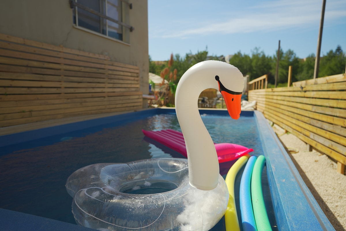 Relax with the whole family in this quiet place to stay. The property has two bedrooms - a bunk bed for children, a bed in the master bedroom. Dining area Large space, overlooking the Tiv'on Mountains landscape, quiet and pleasant. There is an outdoor seating area with a wide patio for children, as well as a swimming pool Private salt water You are invited to us