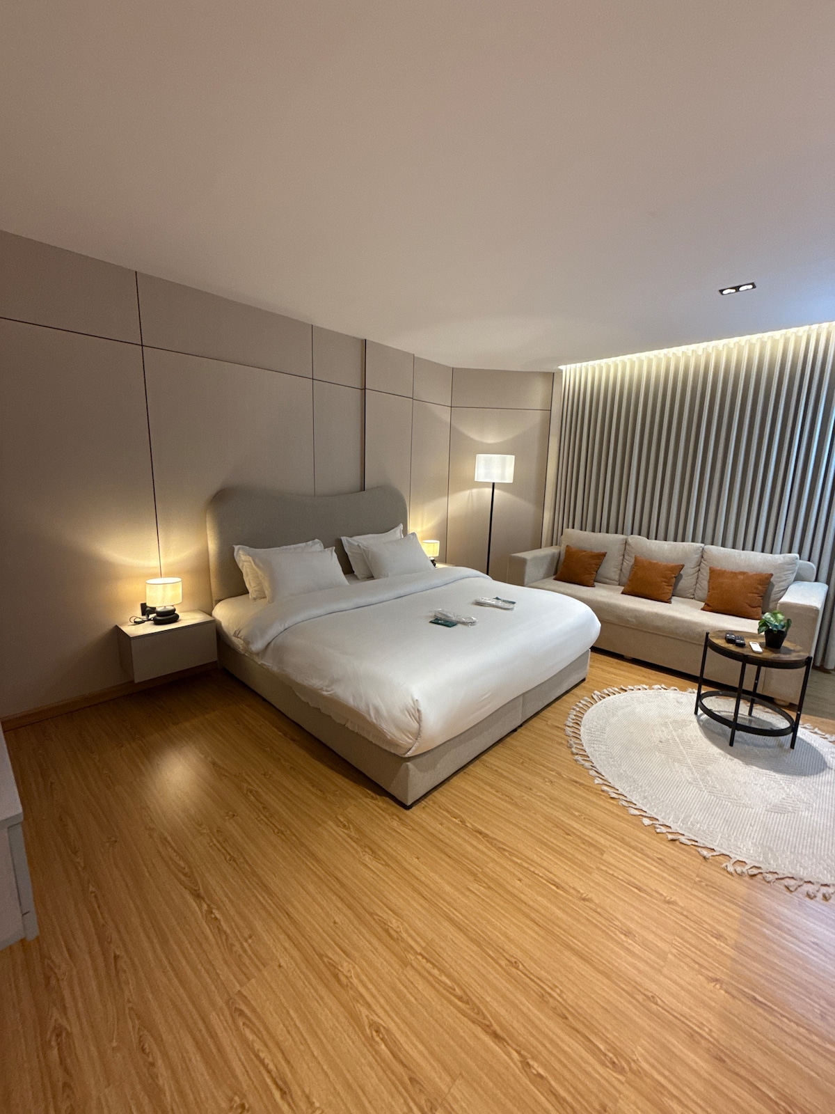 Enjoy the distinctive design of the apartment consisting of a master bedroom and a side hall, designed with great care and love to suit the aspirations of our valued guests. We provided you with the internet at 5G speed to enjoy your favorite movie on a 65-inch TV screen, 10 minutes from the airport and 4 minutes from Al Othaim Mall. You can also enjoy the West Corniche Park, which is a 5-minute walk away