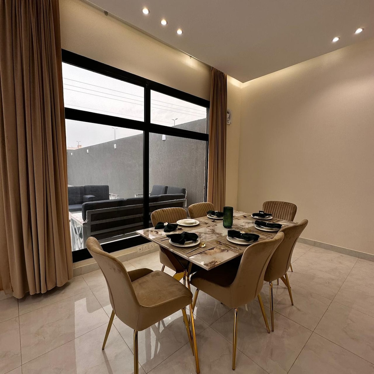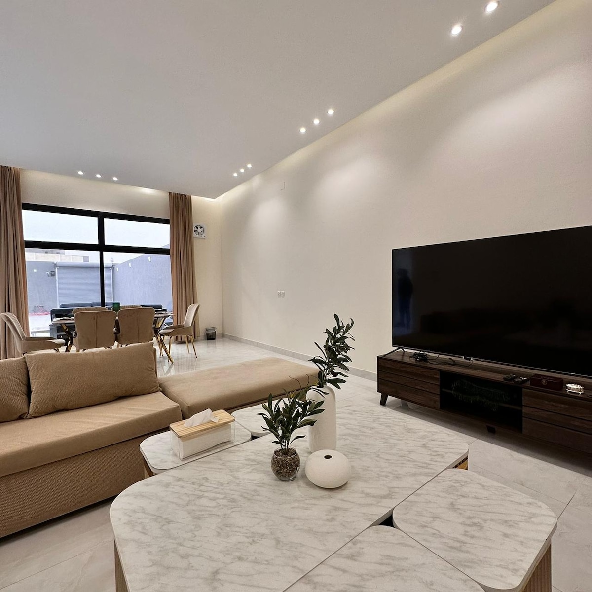 A comfortable hotel lounge with self-check-in without reception, containing two bedrooms, a hall, a kitchen, two bathrooms, a dining table, an outdoor seating with a stove, a car entrance, and all you need of TV, refrigerator, washing machine, microwave, coffee and tea maker, water kettle, and all kinds of perfumes, candles, incense, and fragrance, in addition to all you need of personal care tools "brush, paste, shampoo, conditioner, slippers, and towels" to become one of the best options you resort to after a long working day, and spend the night hours in comfort and recreation until the next day.