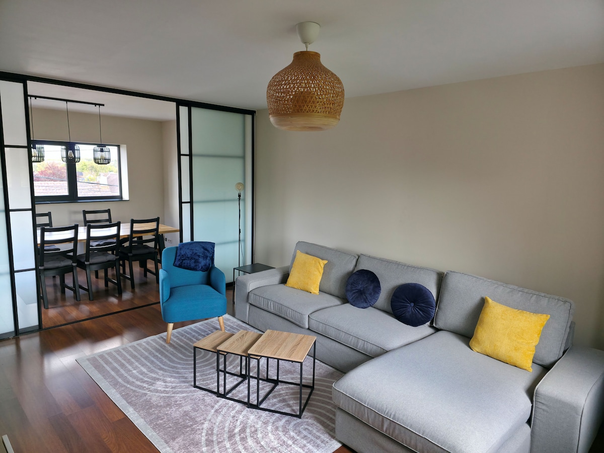 “A bucolic setting or elegant nature and design converge in a harmonious way.” Ideally located, in the heart of the forest and close to all amenities (including the airport), this fully renovated accommodation will seduce you with its location as well as its decor with sophisticated details. The accommodation is spacious, about 60m², composed of a large living room including a sofa bed (140x200cm), a bedroom with double bed, a shower room, a toilet as well as a private terrace with views of the forest.