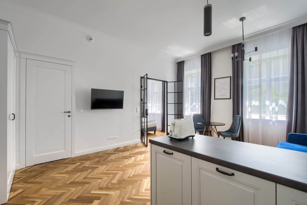 This apartment is located in the heart of the city, where fashionable district harmonize with stylish pre-war buildings. In the neighborhood you can experience the dual character of the city, both by its historical vibe of an old capital and contemporary lifestyle. It's easy to find the right place to celebrate or enjoy time in a variety of restaurants, bars, health spas, craft studios or boutiques studios.