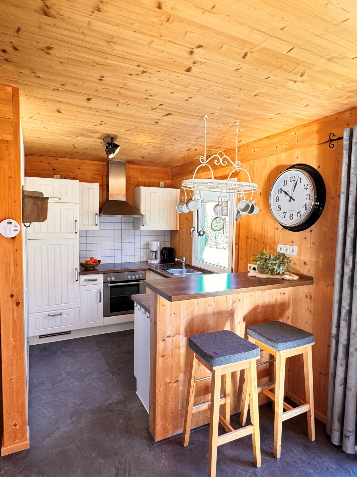 A shower as well as an extra washing facility are integrated. The special gem is our sauna, which is also located on this level. A cooking corner with a small kitchen cabinet, a hot plate, and the most important utensils are also ready for you. A few steps behind the house, a beautiful terrace awaits you for cozy, mild evenings. A staircase leads down to the stream. In the upper area is the bedroom with a double bed and the guest bed.