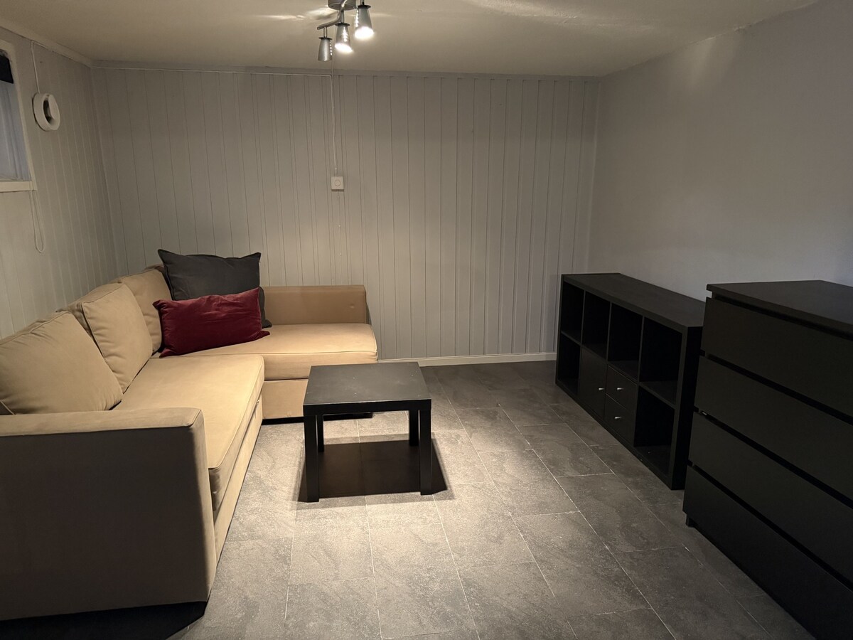 A studio apartment from 2019 with a large bathroom, bedroom and living room/kitchen solution. Private entrance from the back of the house, and access to parking on the front of the house. The rest of the house is inhabited by us and we have three children who can produce some step sound. Otherwise, the dorm is separated from the house by a fireproof and soundproof door,which is locked with a key. TV is only available for AirPlay, and no apps/channels