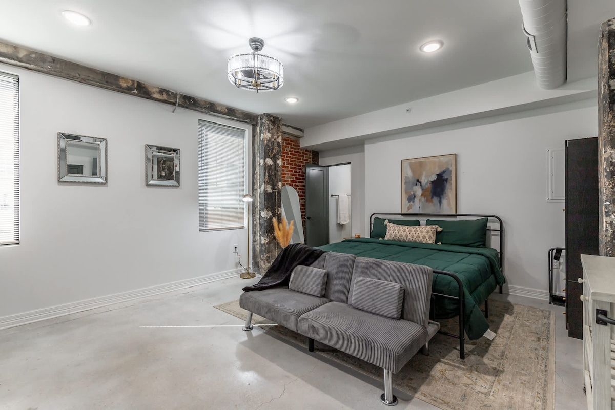 Escape to our modern, quiet, ground-level corner condo in Chattanooga’s vibrant Southside. Perfect for couples or business travelers. Featuring a plush king bed, a dedicated workspace with a sit/stand desk, a private patio, and a private entrance. Enjoy a fully stocked kitchen, in-unit laundry, free dedicated parking space, plus ample street parking. Incredibly walkable—steps from top restaurants, breweries, attractions, and the convention center. Park once and explore on foot.