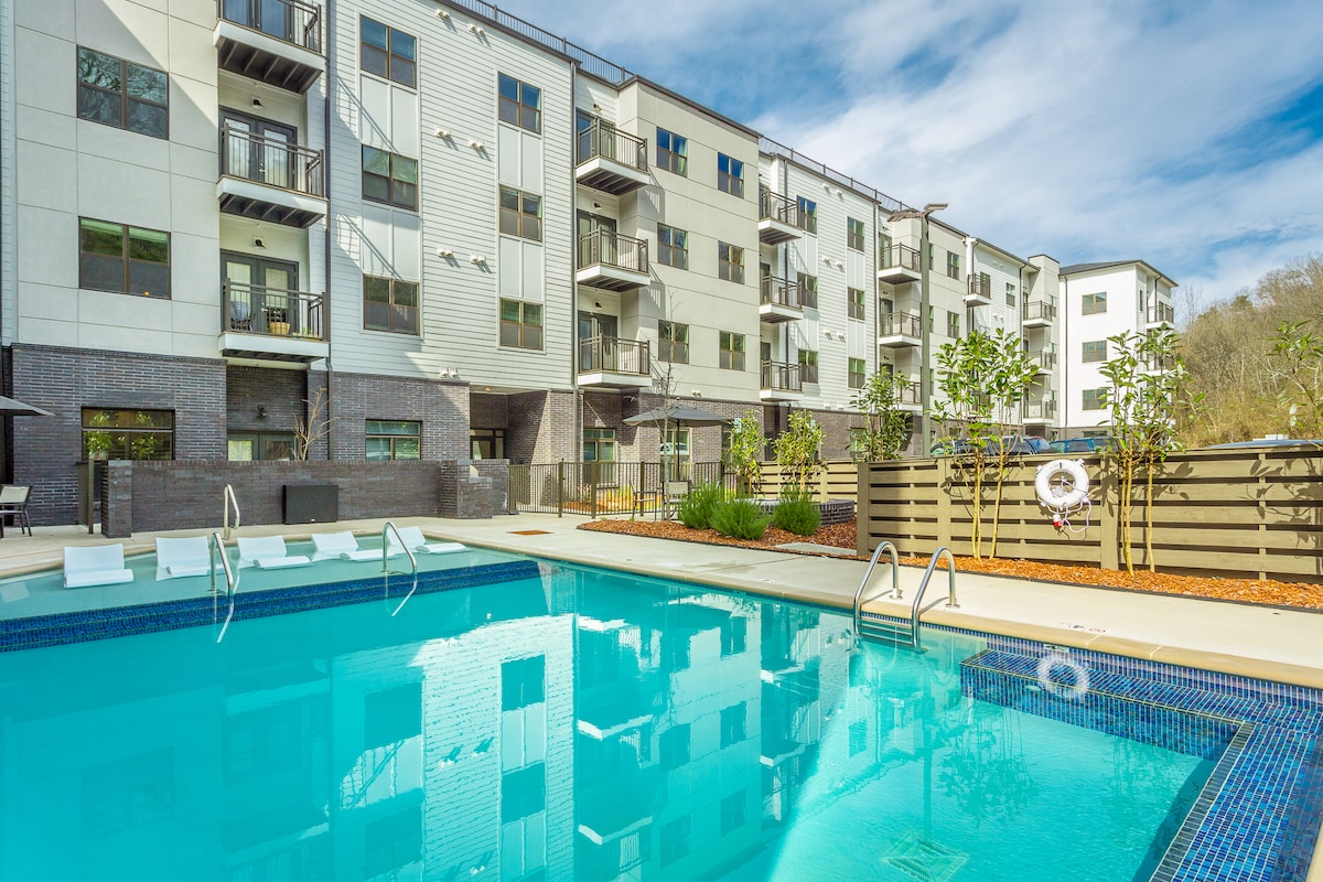 Come stay at our beautifully appointed condo in the heart of Chattanooga and see all our amazing city has to offer! Top floor balcony with majestic mountain views and a thoughtfully curated interior designed to make your stay effortless. Outdoor pool & Gym on property! Located just 0.08 miles from the TN Aquarium & downtown Riverfront and 6 miles from Lookout Mountain. Across the streets is an access point to the TN Riverwalk, a 13-mile paved path perfect for walking, running and biking.