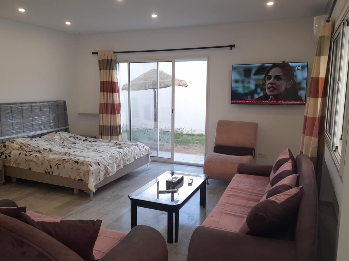 Located in the heart of Port El Kantaoui, this authentic Mediterranean-style studio welcomes you in a peaceful and bright setting. On the ground floor, it enjoys a south-facing orientation that floods the space with sunshine throughout the day. The living room opens onto a beautiful private terrace, ideal for your moments of relaxation or alfresco dining. A short walk from the beach and amenities, this studio is perfect for enjoying Tunisian coastal charm in a typical and warm setting.
