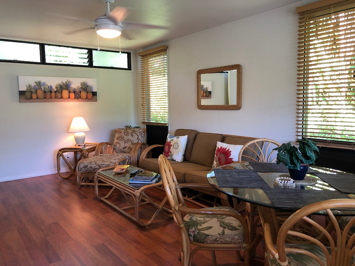 A modern surf oasis nestled on an overlook with panoramic ocean views, stunning sunsets, and the famous Bali Hai. We are featured in the June issue Sunset Magazine. You'll never want to leave this modern Hawaiian styled 2 bedroom, 2 bath condo. We have everything you’ll need and want for the most relaxing stay of your island vacation and only steps away from food, drinks, the pool and the beach. Whale watch from the lana'i in the winter, or snorkel our beautiful Hideaways beach in the summer.