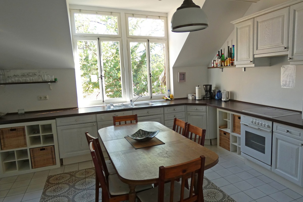 Nice generous and tastefully furnished Appartment in listed villa. The whole upper floor with separate entrance offers place for 2-8 people. 3 bedrooms with double beds. An additional sleeping couch, one double bed and one additional single bed in the large living room. Unfortunately, due to the sharp rise in energy prices, I have to charge an additional fee, which is noted under the "Cleaning" item.