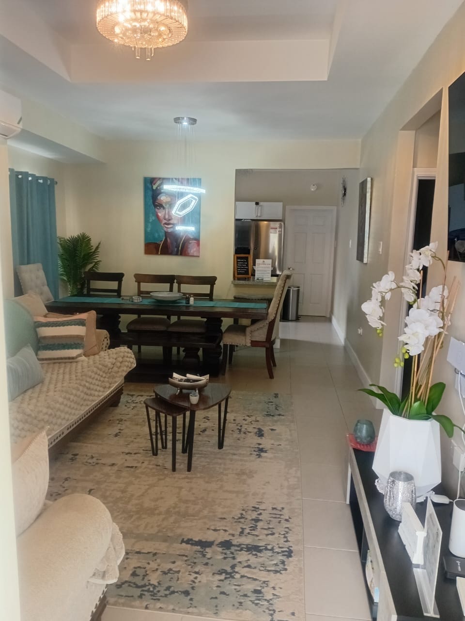 Unwind in this gorgeous modern yet rustic decorated coastal home in a quiet gated community. Fully equipped to be your home away from home. The home boasts 3 beautiful bedrooms and 2 bathrooms. Plenty of space to keep up with your daily routine. The kitchen features stainless steel appliances. Enjoy your meals around our dining table or take it to the backyard lounge area. Enjoy a view of the sea and the mountains just looking from the veranda. End the day with a movie in our comfy living room.