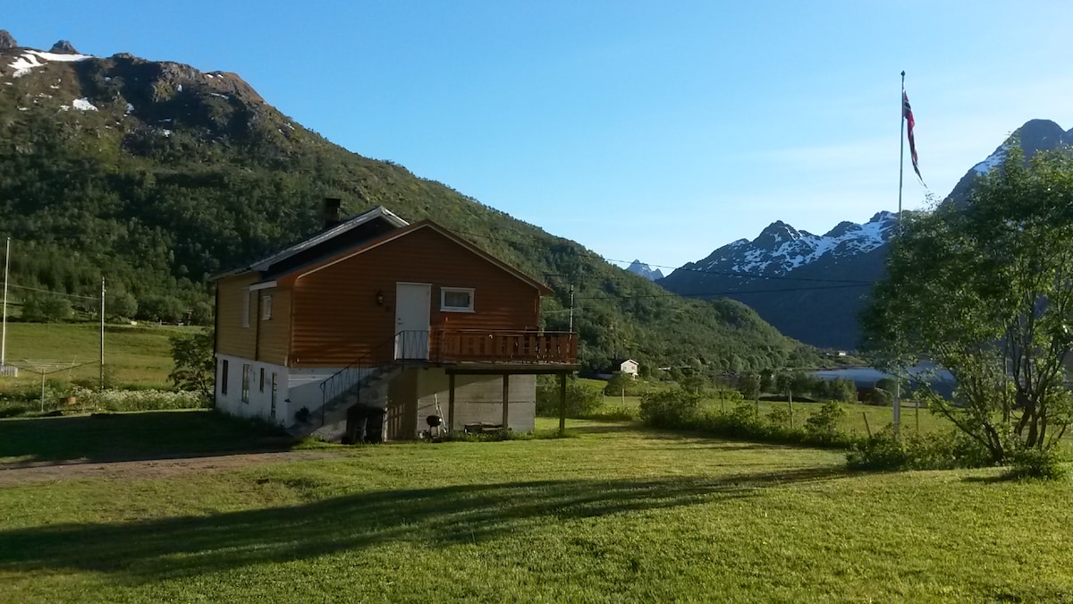 Welcome to our peaceful accommodation in the countryside with a balcony and beautiful views of the Lofoten mountains, the sea, the northern lights and the midnight sun. Own apartment on the 2nd floor in the garage with a balcony, bathroom, combined kitchen and living room with a double bed for two people, a sofa bed for two people and two extra guest beds. There is also a home cinema system. Short drive to Lofoten, moose safari, reindeer farm, whale watching and other nature experiences.