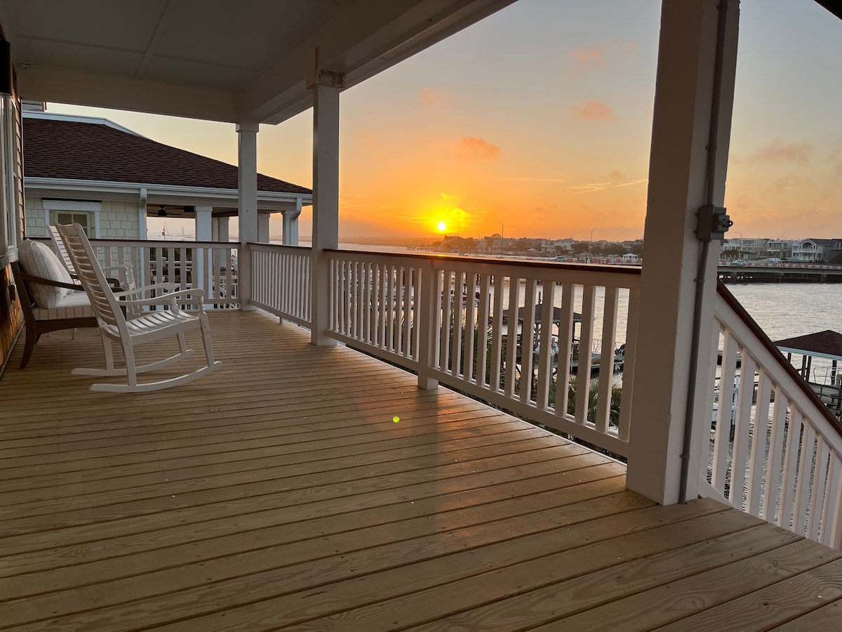 Beautifully located duplex in the tree lined Harbor Island community of Wrightsville Beach. Amazing view of Banks Channel from the top floor porch/sunroom along with the back door stunning sunset view over the marsh and elementary school. Enjoy riding our bikes, paddling on provided kayaks in Banks Channel across the street, a jog around the famous 2.5 mi loop, or a fun day at the beach! Easy 10-minute walk or very short bike ride to the beach, bars, restaurants, coffee, shopping, and ice cream