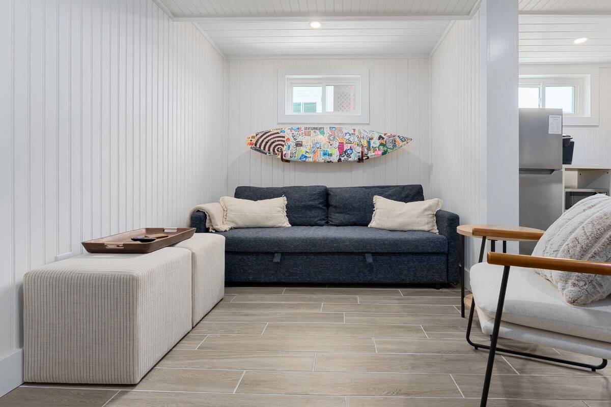 A classic 1946 duplex cottage on the outside, reimagined as a modern coastal retreat on the inside, The Bungalow Loft blends timeless charm with contemporary comfort. This thoughtfully designed space features one bedroom, two additional daybeds in the living area, a full bathroom, a well-equipped kitchen, and a cozy dining nook. Step outside to enjoy expansive outdoor living, complete with a front porch, spacious deck, fire pit, and refreshing outdoor shower.