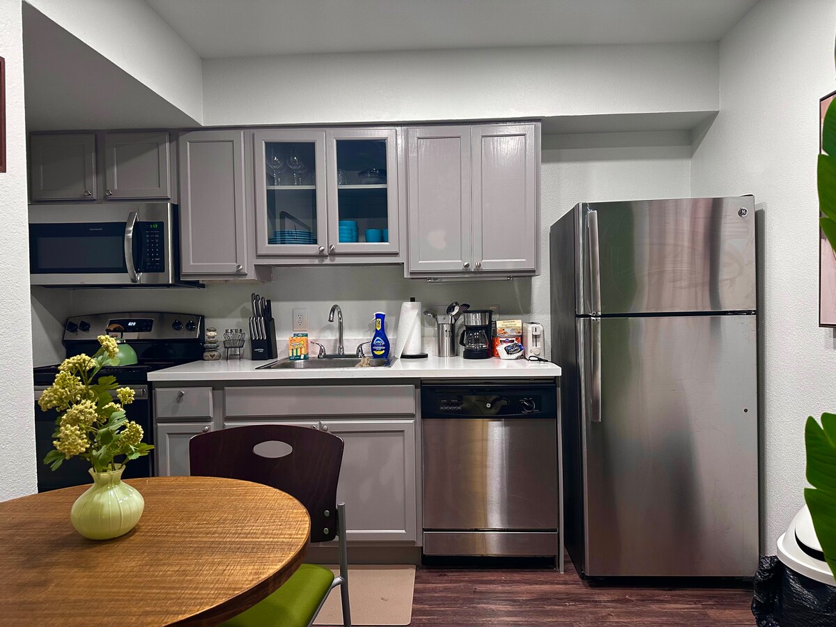Feel at home in this spacious 700+ square-foot vibrant condominium that features a large living room which includes a plush sleeper sofa, this comes with a temperpedic mattress, flat 55 inch TV screen that swivels in any direction of living room or kitchen area to fit your needs when you are in the kitchen or relaxing on the comfy sofa. Wi-Fi, stainless steel appliances, excellent pots & pans for the chef at heart, gourmet beverages and a verity of wines, luxury linens and bathbomds/bath salts.