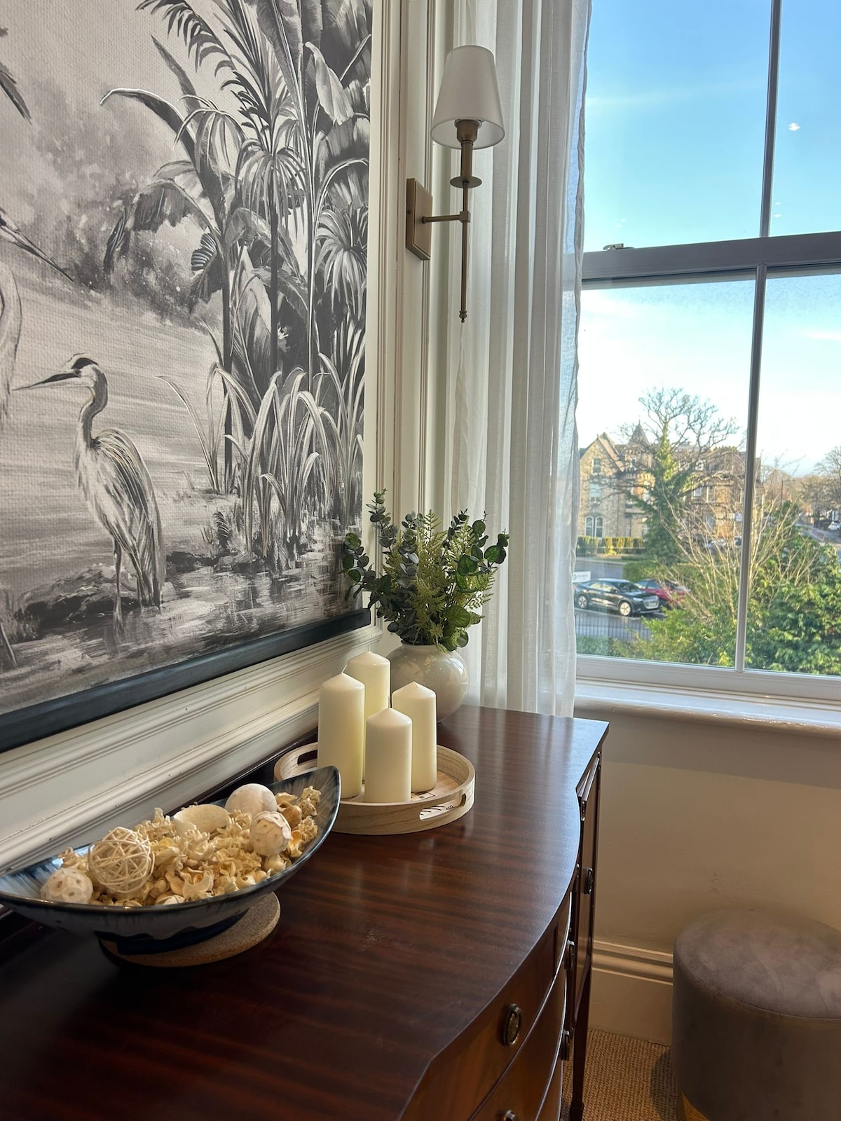 We look forward to welcoming you to our lovely apartment, the ground floor of a 1930s detached house, situated on a quiet leafy road within a five minute walk of Harrogate’s wonderful array of shops and restaurants. The apartment is light and airy, styled with reference to both period elements and to its Harrogate location. As well as welcome food and drink goodies, guests will receive a complimentary copy of ‘So Very Harrogate’, a photography book highlighting attractions in the local area.