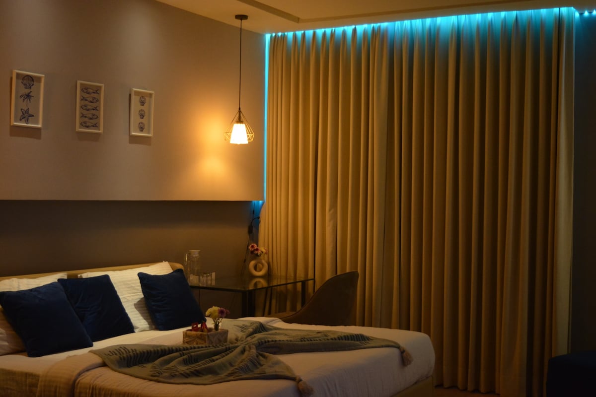 Welcome to our amazing suite which is situated on 15th floor of a high rise building. This 2bhk is completely fresh apartment. Wide private patio with city skyline view makes it unique in class. The place is perfect for relaxing and enjoying scenic view of modern architecture. Apartment is loaded with 3 smart tvs (all applications works), 2 cozy double bed, 2 big wardrobe with locker, 6 seater sofa, stylish coffee table,iron board, fridge,microwave,induction,electric kettle, toaster & much more