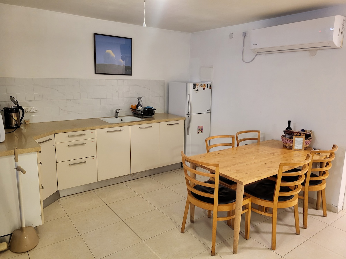 Our apartment has a convenient private entrance. It contains a separate bedroom (which is the bomb shelter shared with my family), large bathroom, and a living space divided into a sleeping area with bunk and single beds and a lounge with a couch and flat-screen with Netflix and WiFi. Our kitchen area includes a toaster oven, electric stove and large sink. The dining table seats 6. There is an air conditioner and several fans. It's hard to find such family-friendly accommodation in Tel Mond.