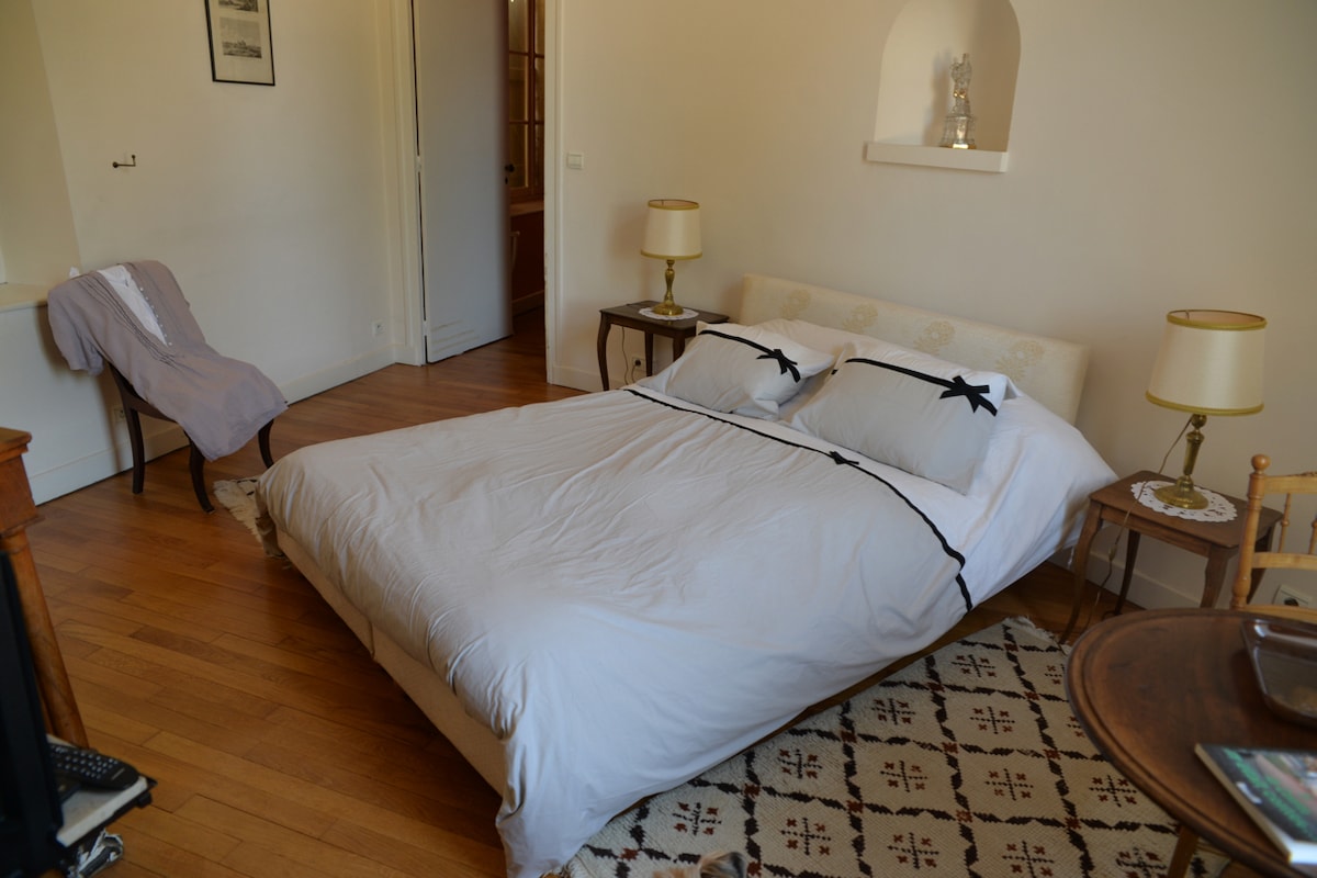 Enjoy a large bedroom in the 60 m2 castle with fireplace and 14th century tiles Modern style bathroom and private toilet. Room on the second floor of the castle, with a 160cm double bed. Breakfast included in the room price.