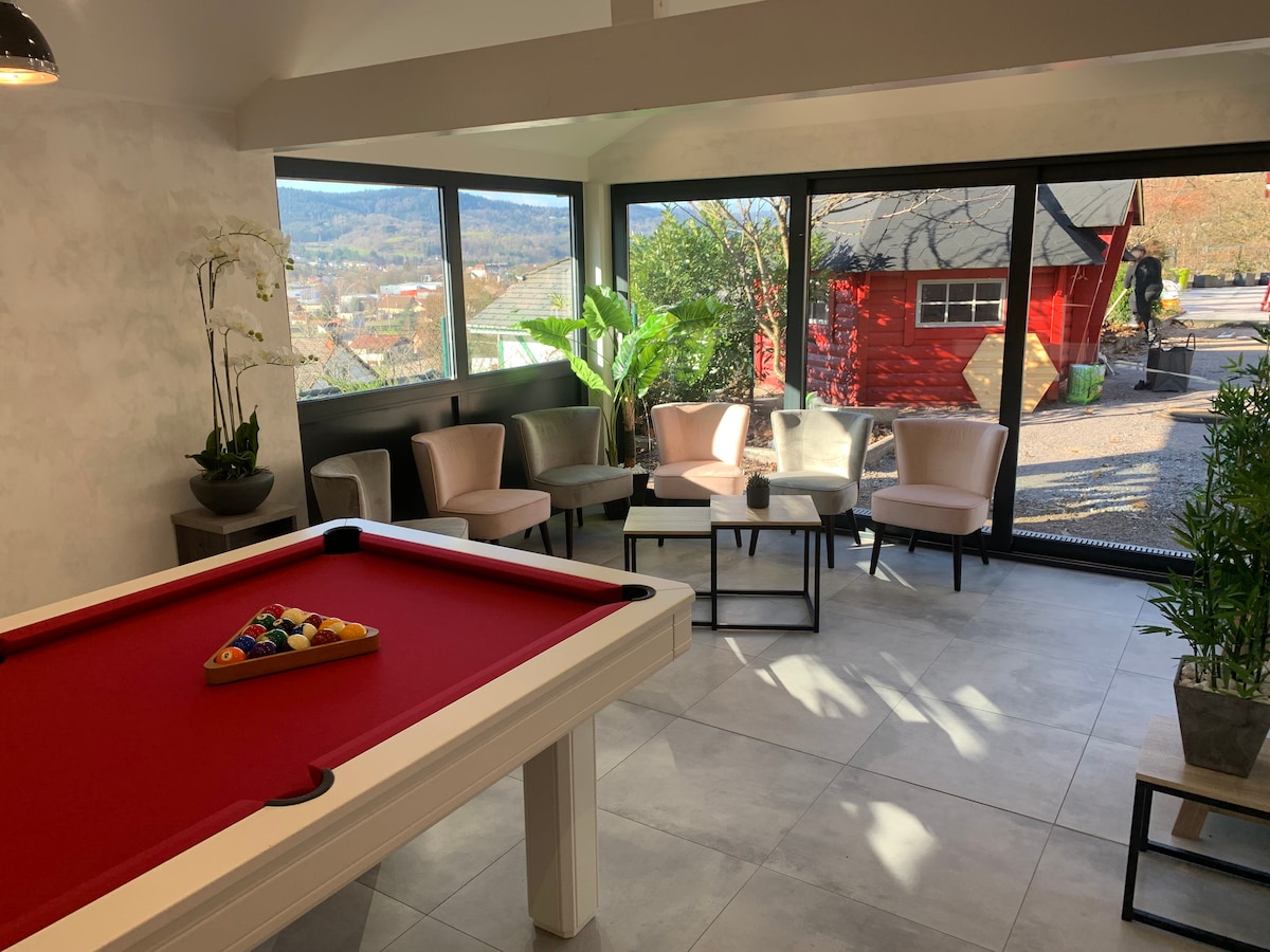 Located in Echenoz-la-Méline, 500 m from Vesoul, this new villa of more than 130 m² has been specially built to offer a unique escape experience for 2 🥰 Intimate & luxurious, it has an indoor pool heated to 29°C, a wellness area with SPA/Jacuzzi, infrared SAUNA, as well as a nice terrace, inviting you to a total release 🍃 For leisure lovers, a private movie theater, pool table & dart board promise moments of pleasure. See you soon✨