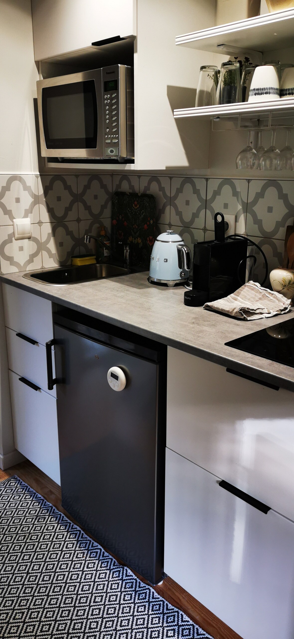 New single-room apartment on the ground floor adjoining the villa. Quiet neighborhood. 2 small outdoor tables and chairs, sun loungers, umbrella, 2-wheel shelter. Composition of the accommodation: living room with a kitchenette area, bedroom-office, bathroom with large walk-in shower. Living room: TV, 108 cm wide sofa bed with mattress topper. Equipped kitchenette, 2-burner glass-ceramic hob, fridge-top, microwave, washing machine. Bedroom: 140 cm double bed, desk, wardrobe. Wifi. Board games. Library.