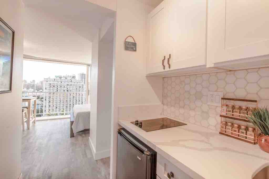 Aloha! Welcome to your perfect getaway,fully equipped accommodation with kitchenette.Everything you need to enjoy your time on the island. Exceptional Amenities, NO resort fees! Elevated views, picturesque cityscape backdrop+ Beach Gear. The ideal condotel offering for extended stays, travelling professionals or a quick vacation.A blended space of traditional Hawaiiana and contemporary furnishings and hand-curated local artwork.Comfortably accommodates 3-4 people.Your home, away from home.