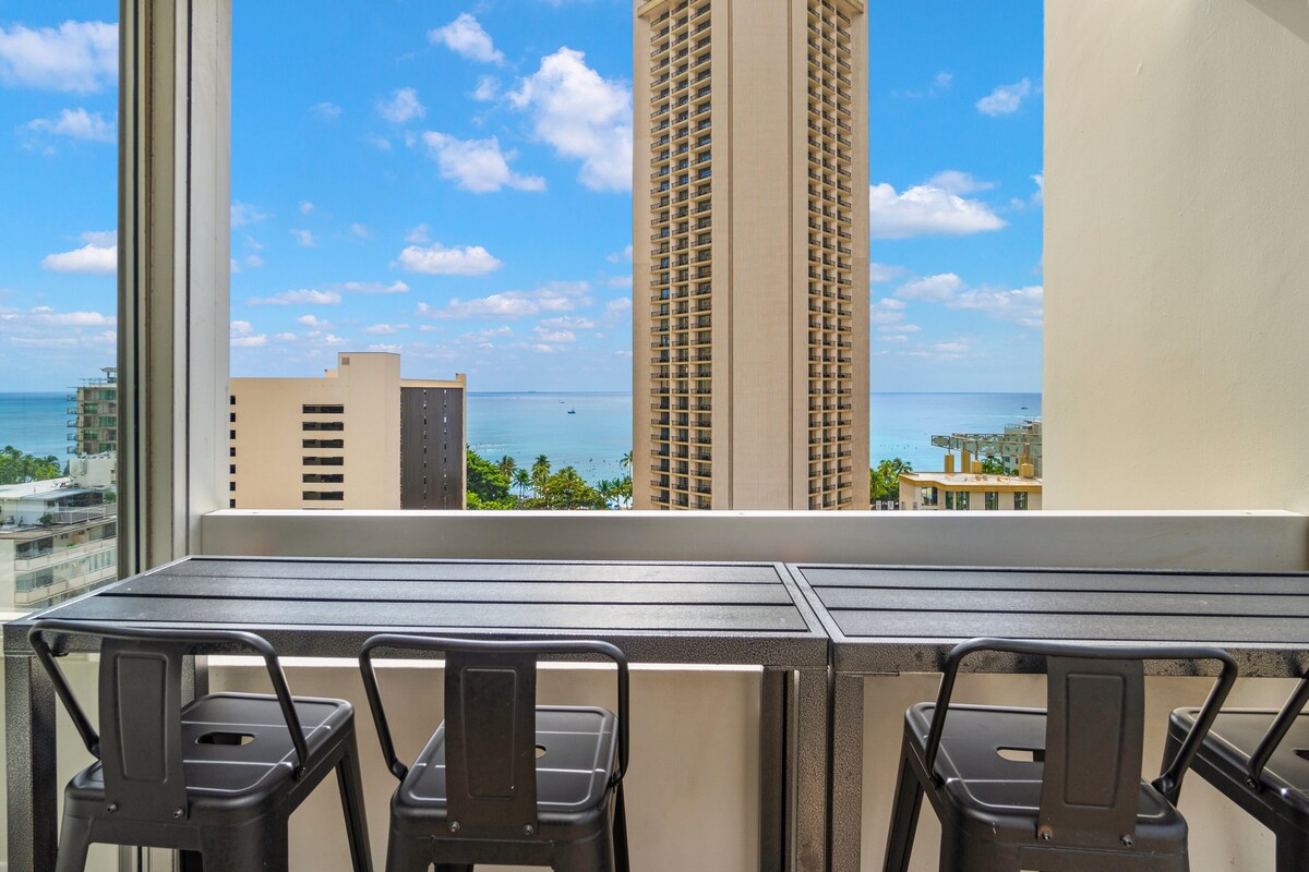Welcome to your perfect island getaway for the 'Ohana! This clean & comfortable studio retreat sits on the 18th fl. of a resort-style building. Just one block from the beach & steps away from popular local restaurants, shops, & cafes. Our haven includes: queen sized bed+queen sofa sleeper, fully equipped kitchenette, high speed Wifi, TV, family games & beach gear included for your adventures! Come & unwind to explore the island in our home with the convenience of a prime location!