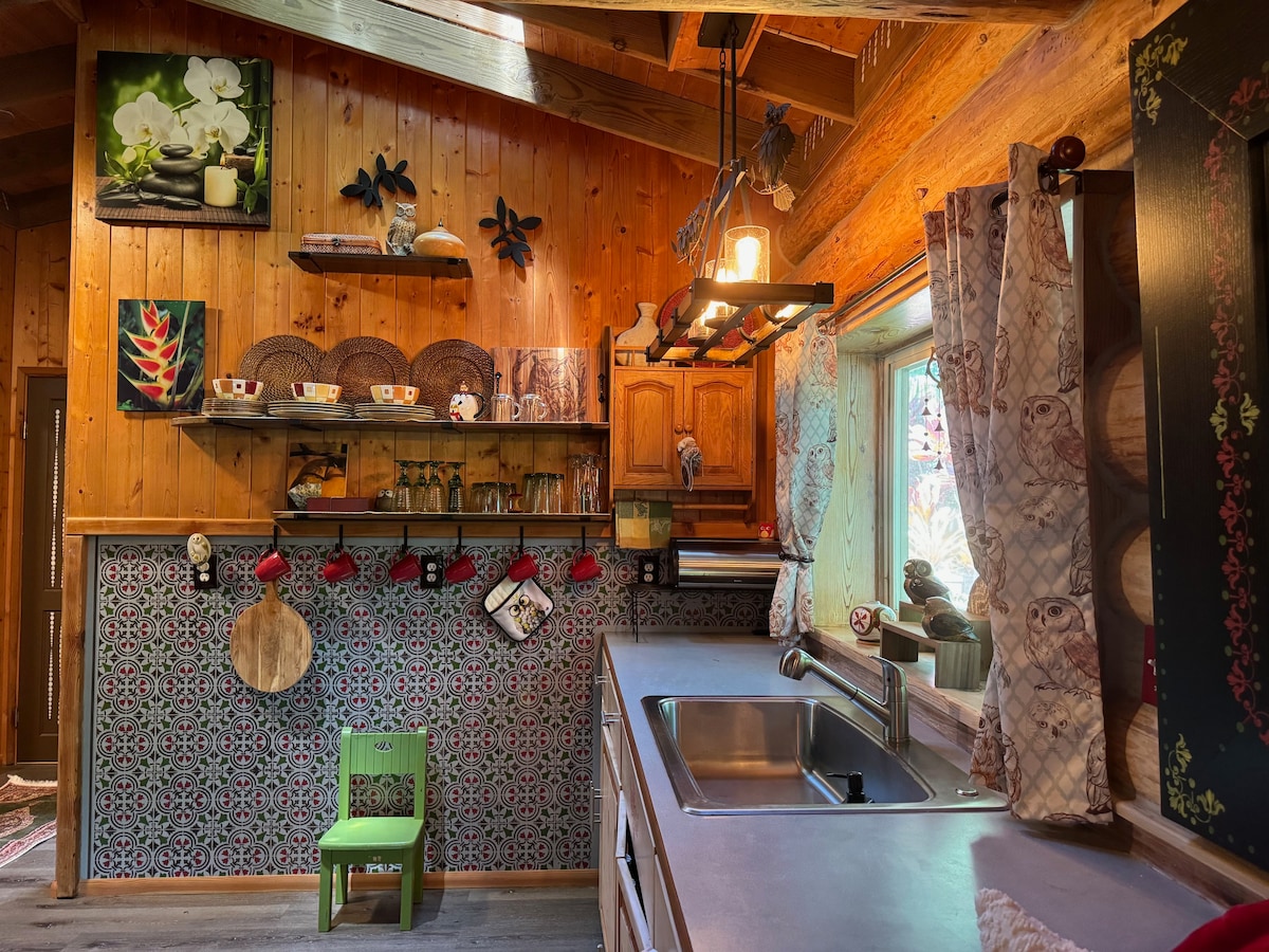 The Owl Nest: Family friendly. Be immersed in nature at our peaceful, cozy stream side retreat. Located next to the Waipio Lookout, our Hamakua Coast rain forest property is the perfect place for two adults with one child stays. Hear the rush of our waterfall and adventure in our private oasis. Discover the magic of the “Owl Nest”, a large spacious high-ceiling one bedroom space attached to the primary residence log cabin. Garden views from every window. Cozy, serene and fully appointed.