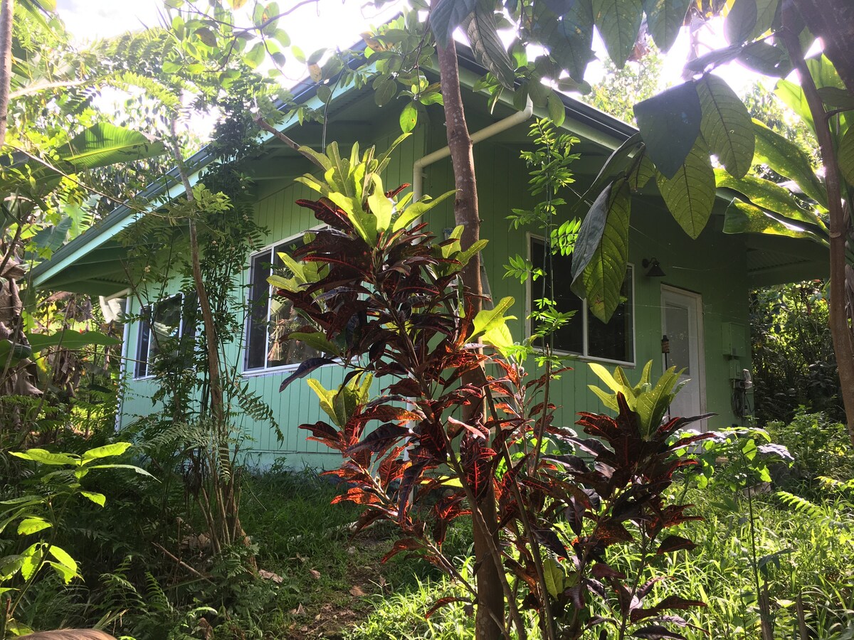 Licensed vacation rental on small banana farm 1 mi. from Kehena black sand beach, one of the least developed populated coasts in Hawaii. King bed, AC, full kitchen, screened lanai, outdoor shower & Jacuzzi bathtub/shower. Nearby viewing of the 2018 lava flow, swimming, snorkeling, hiking. Located in rural Kalapana Seaview neighborhood. Nearest store 10 mins, town with services is Pahoa, 20 mins away. Hilo, 45-60 minutes away. Volcano Park 1 hour. All of island accessible for day trips.