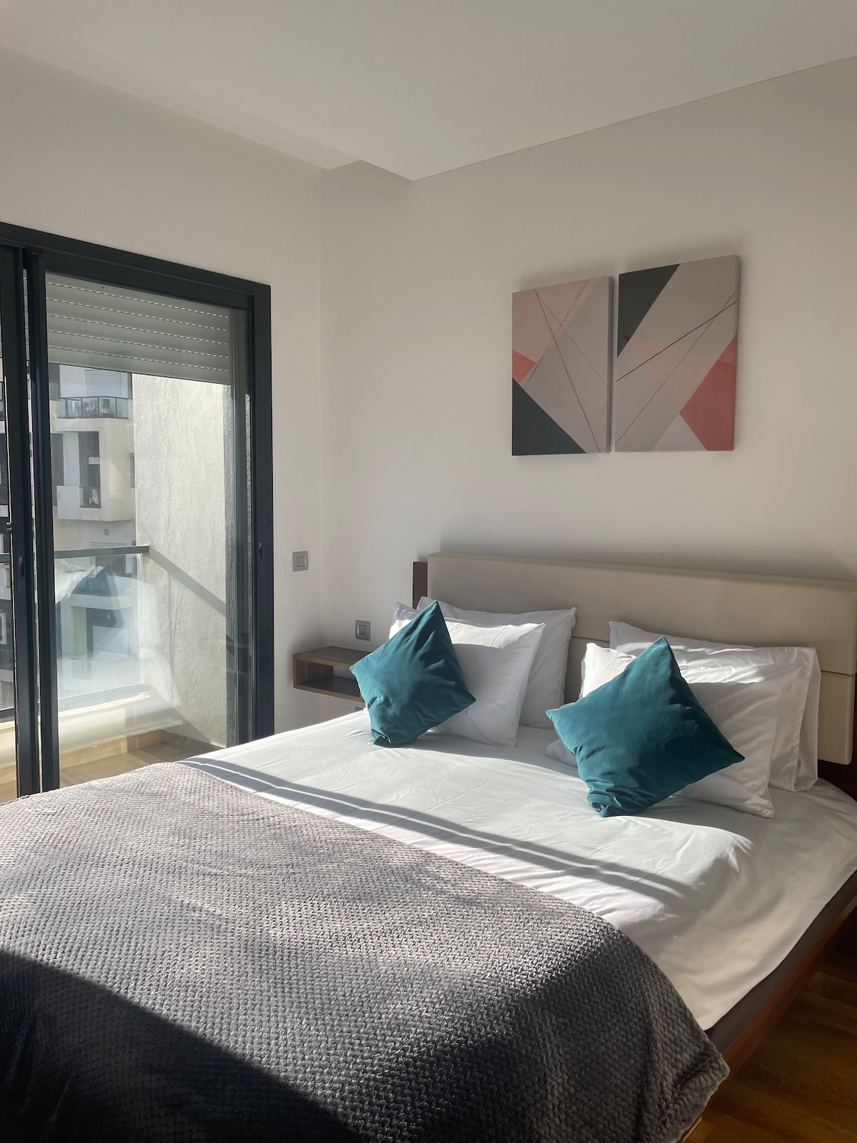 📍Riad Extension, Vue dégagée sur forêt, Immeuble calme 🏟️ CAN 2025 🔥 : À 5 min 🚙 du Stade Moulay Abdellah 🏖️ À 8 min 🚙 de la plage de Harhoura 🛒 ☕ À proximité des restaurants, cafés et commerces de la zone Oulad Mtaa ✨ Éveillez vos sens, dormez au calme. Blue Horizon, un lieu paisible et raffiné au cœur de Riad Extension, pensé pour vous offrir calme, confort et modernité. Profitez d’une vue dégagée, entre bleu de la mer et verdure de la forêt, sans aucun vis-à-vis.