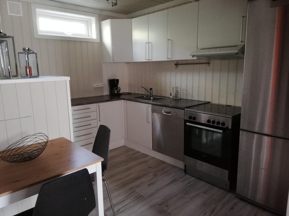 Your private serviced apartment is equipped with bathroom and kitchenette. Fully furnished with bed, utensils, hotplates, microwave oven, refrigerator/freezer unit, TV, sheets and towels. Parking. WiFi + LAN. Shared garden and laundry room etc. Well insulated. We can adjust furniture and services for guests staying longer.