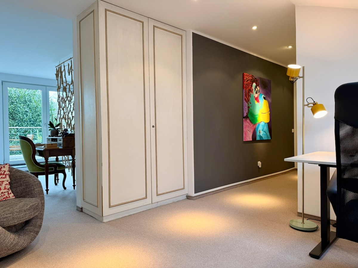 A special accommodation with a loft character. A loft designed with great attention to detail with a double bed and sofa bed for 3 - 4 people. A spacious bathroom with bath/shower. Open space with self-catering kitchen. Private outdoor area with table and garden couch. Despite a shared property with a historic house, complete independence and privacy. A perfect retreat on the edge of the forest for nature lovers. 8 min to Lake Baldeney. Public transport (5 min to the bus/14 min to the S-Bahn)