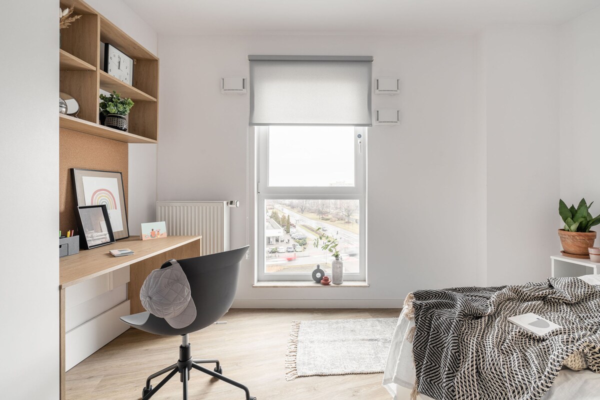 Comfortably furnished apartment that can accommodate up to 3 people, with a balcony, free parking space in a secure underground garage, gym and a terrace on the roof with fantastic views of the two rivers Motława and Martwa Wisła and the historic cranes of the Gdańsk Shipyard. The apartment is located on the banks of the Motława River, very close to the WW II Museum, in a modern building Chlebova with 24:7 security. A 15-minute walk along the Motława River and you are at the Gdańsk Crane!