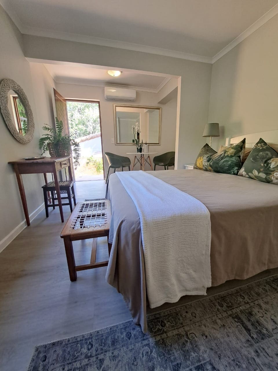 A tranquil indoor-outdoor living space ideal for couples or business travelers. The stylish studio opens up onto a large patio with braai. Enjoy our long summers outdoors! The studio has a separate entrance from the main house. Queen bed with open walk-in shower & separate toilette . It has fiber WI-FI, full DSTV, a tiny kitchenette with tea/coffee facilities, toaster, microwave, fridge & single induction plate. Secure onsite parking. We have 2 Small dogs for added security.