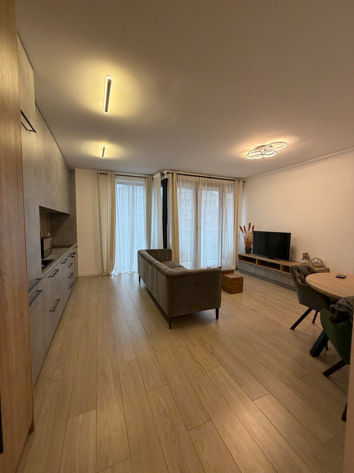 Aceasta locuință călduroasă și luminoasă este situată într-un complex rezidențial nou și modern ce oferă pază și recepție permanentă. Locul de parcare în subteranul imobilului. Spațiul: - un dormitor cu pat dublu - living cu canapea extensibila - Netflix & Wi-Fi - bucatarie cu aragaz, cuptor, frigider, mașina de spălat vase, mașina de spălat haine, expresor - o baie cu cadă și uscător de păr - aer condiționat în fiecare cameră - fier și masă de călcat -bucătăria este utilată comple