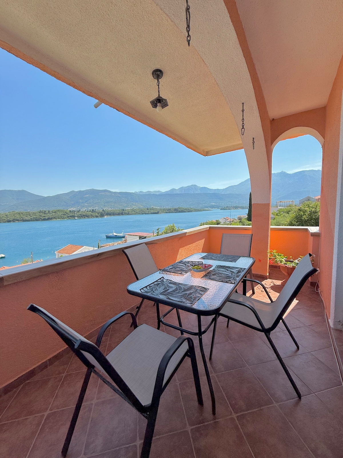 The apartment are located a LITTLE UPHILL so it hawe beautiful views of the entire Bay of Boka and Tivat.Apatmani is new, you hawe garage for car. Apartment will welcome you to my home-grown wine and beer from Montenegro,In the evening on the terrace there is a unique peace of the city noise and a fantastic view of the whole City and Bay,My place is neer to the airport, the beach, and Bus station. You’ll love my place because of the outdoors space and the light and quiet for holiday.WELCOME
