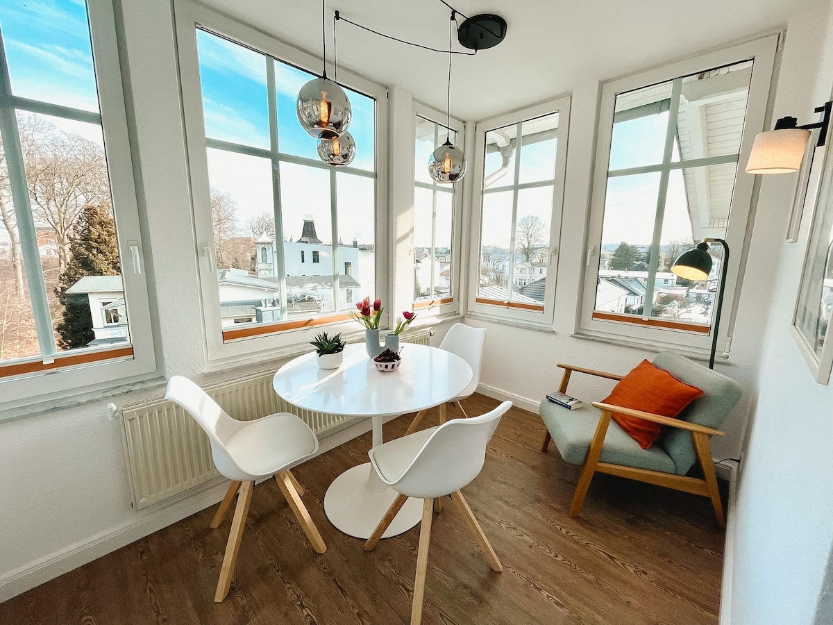 ALTE BUCHDRUCKEREI (Bäderarchitektur, denkmalgeschützt) - eine strandnahe, individuell eingerichtete 92,5qm-Ferienwohnung über 2 Etagen, mit 2 Schlafzimmern (1x mit Doppelbett 1,80m und 1x mit Bett 1,40m). Im EG befindet sich eine komplett ausgestattete Küche und das Esszimmer. Eine Sitzecke im sonnigen Vorgarten gehört ebenfalls zur Wohnung. Im OG ist der wintergartenähnlichem Verandenvorbau hervorzuheben. Dieser lässt sich durch Vertikalschiebefenster öffnen und wie eine Loggia nutzen.