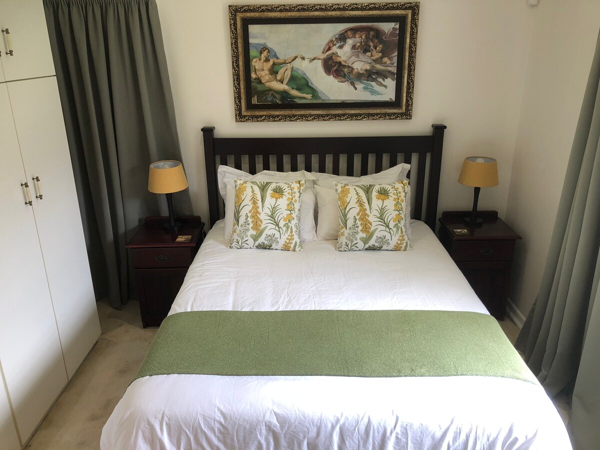 Come see the whales and taste the wine! Romantic, self-catering cottage with quality finishes in secure estate, Onrus – 30 min walk to beach. Nestled among trees, safe, private, own entrance. Sleeps 2 adults in en-suite bedroom + 2 adults/children on bunk beds in lounge (no children under 2 years plse). Free sherry & firewood! Wi-fi, DSTV, Netflix, free parking. Sun deck with gas BBQ. Quality linen. Aircon. Markets, wine routes & nature walks. Note: There are stairs. GENERATOR FOR LOADSHEDDING