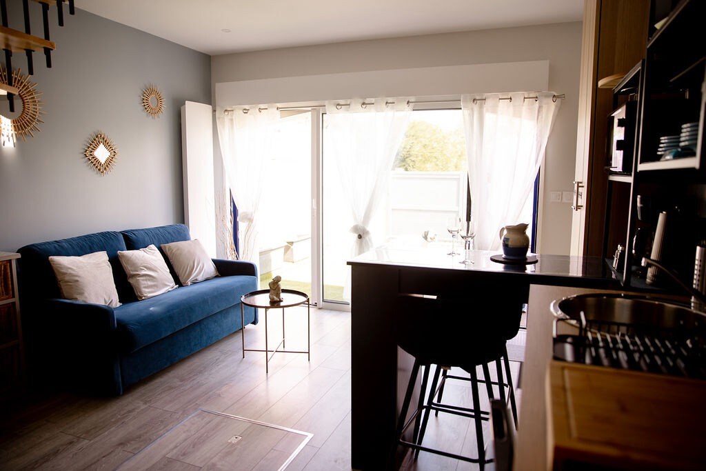 Welcome to our cosy detached chalet, ideally located in a quiet, wooded estate just 900 metres from the beach! Whether you're looking for a breath of sea air in winter (the accommodation is perfectly insulated and very comfortable) or for a lively summer holiday, our stylish haven is the perfect place to stay. You will enjoy a comfortable and well-appointed interior, featuring one bedroom (with a queen-size bed for restful nights) and a fully equipped kitchen. Wifi connections