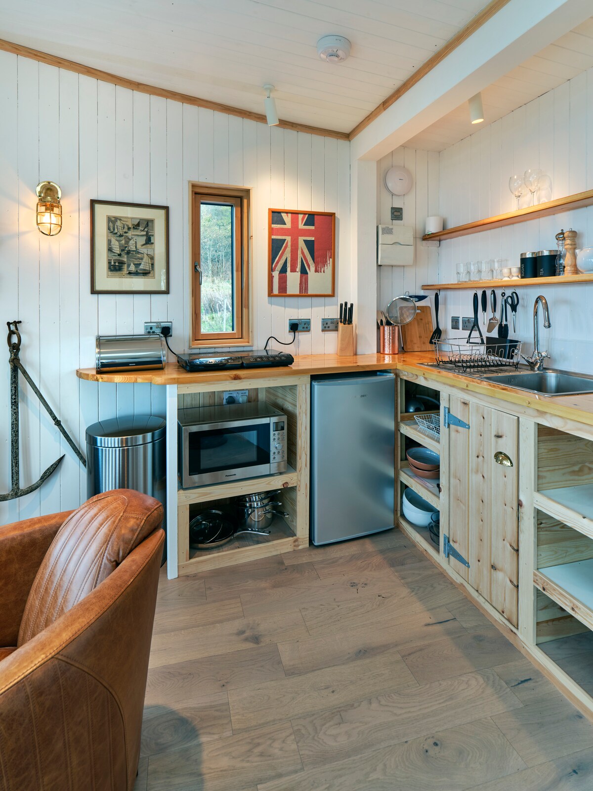 NEW....The Captains Cabin is a delightful, compact elliptical cabin with outstanding views over the Sound of Mull.Situated on the same 4 area site as AirShip 002 and The Pilot House it has its own private balcony (with steamer chairs) which extends over the whole flat roof of the old chapel below. It comprises a nautically themed saloon and galley, bedroom with a king size bed and a shower room.Highly insulated with underfloor heating and a 100% renewable energy supply and delicious spring water