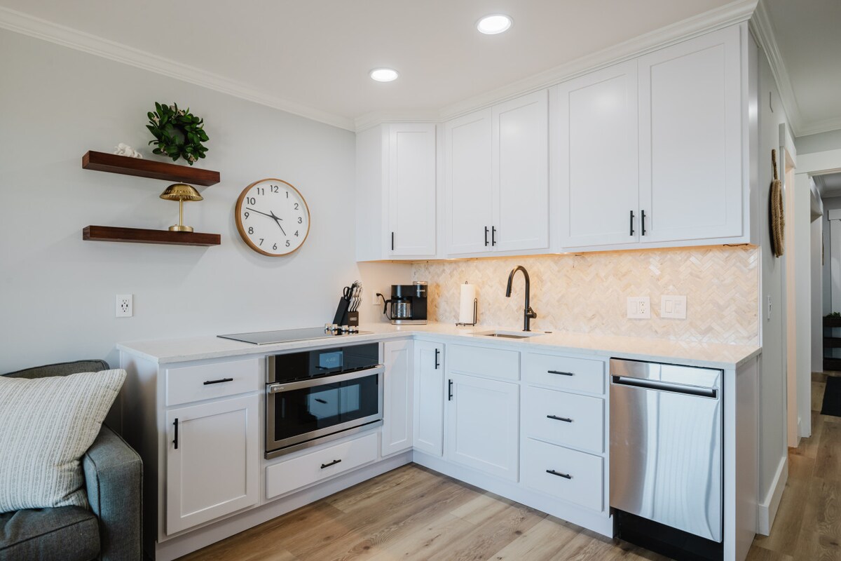 The kitchen features modern appliances, including a stainless steel refrigerator and a sleek oven. White cabinetry with glass accents showcases dishware. A marble countertop provides ample workspace, and recessed lighting brightens the room, enhancing its inviting ambiance.