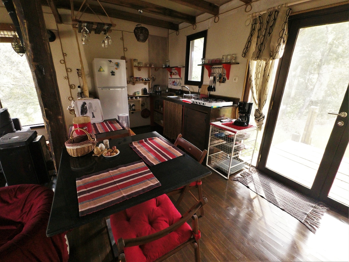 Our wooden house is located in a big private garden. It offers privacy and uninterrupted views of the beautiful surroundings. The self-catering accomodation. The house is open-plan living area with a single bed, an eating area and kitchenette, with a separate bedroom a double bed and bathroom. The house is fully equipped, bedding and towels are provided. Sit on the deck and enjoy the view while listening to the sound of nature and the river flowing beside you. Have a nice time :)