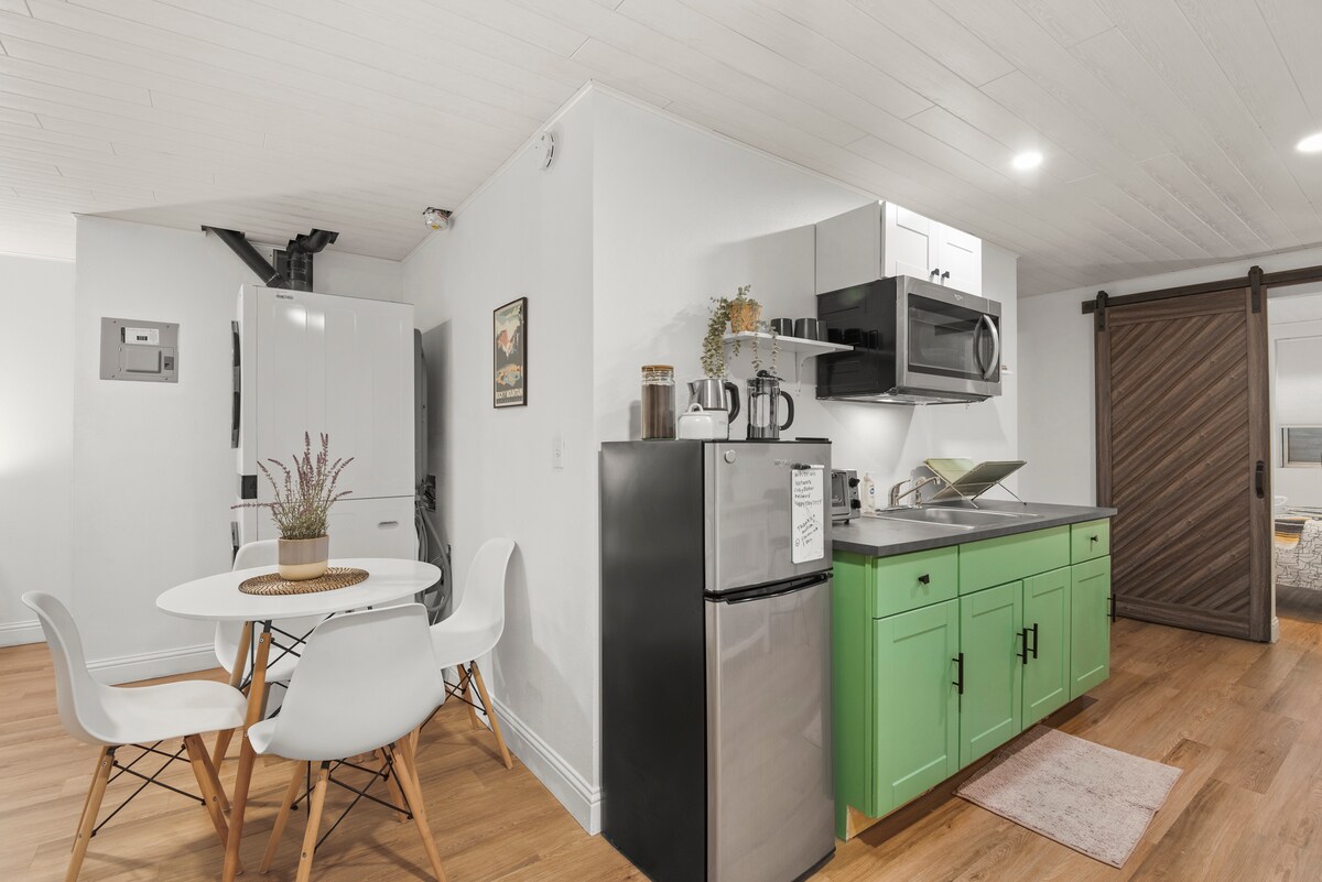 This unique place has a style all its own. Abstract artist Romelle is known for colorful, energetic work that explores the modalities of healing with color. This spacious studio comes equipped with a pillow top queen bed, kitchenette, and glass tiled en suite bathroom. Work from home with blazing internet speeds, or venture out to the many coffee shops, and restaurants steps from our door. Our central location provides the perfect launch pad to all of your travel and business needs in Denver.