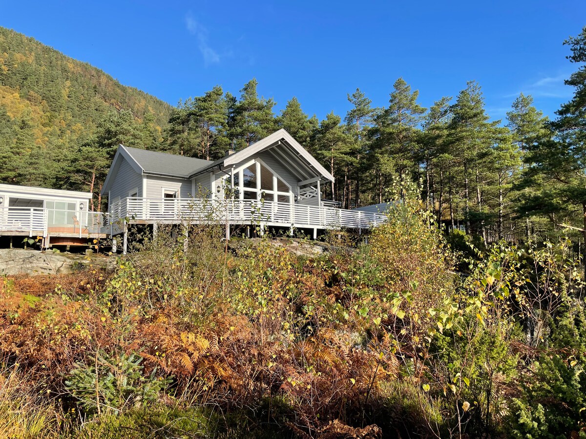 Enjoy fantastic sea views and sunsets in a new modern cabin! Its a quiet area surronded by amazing views and lovely hikes just outside the cabin. It's only one hour drive from Stavanger and the airport. 10 min walk to public beach. All on one level, 150m2. Large private parking. Jacuzzi and big terrasse. Perfect with small kids - relax in the jacuzzi after hike or when kids are sleeping. We have babychairs,babybed etc. Well equipped kitchen, homeoffice with 2screens Pets not allowed
