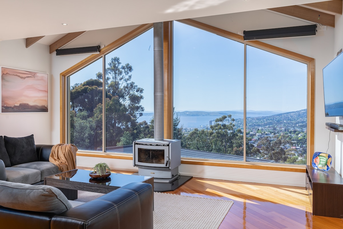 Glasshouse is a one-of-a-kind architectural gem. Perched high, with sweeping views over the Derwent River, it's the perfect place to lose yourself in the ever changing expansive views. Stunning sunrises and moon rises over the water. Nestled in nature with wildlife on the front lawns, yet just a hop, skip, and jump away from vibrant coffee shops, restaurants, and art galleries. Experience floor-to-ceiling windows that stretch across two stories, a loft-style bedroom, and a luxurious bath.