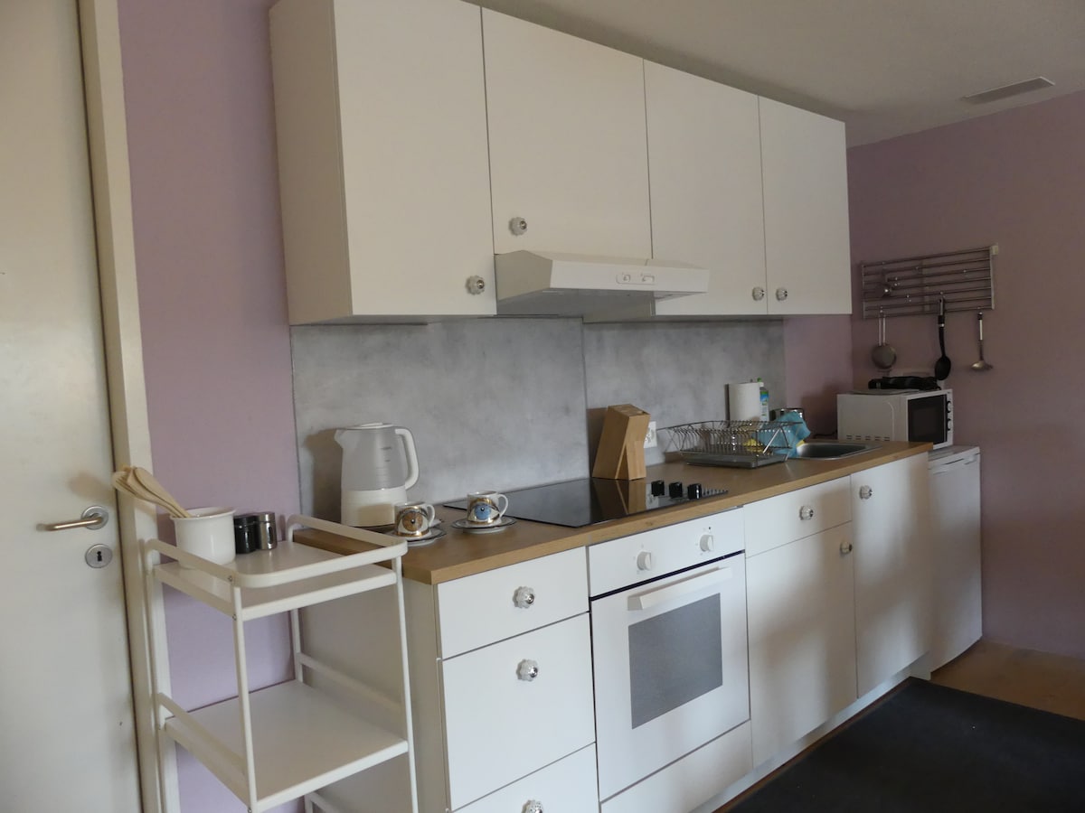 This three-room annex flat, with its own entrance, bathroom and kitchen, is located in the former rural school building, which was fully renovated in 2016. Surrounded by nature and with views of the local mountains, you can enjoy peace and quiet! The city of Lucerne can be reached in 10 minutes by car. Various excursion destinations nearby. A CAR IS NECESSARY AS THERE IS NO BUS SERVICE. (Uber/taxi) Our conference room for companies is located in the central section. We live on the top floor in our own flat, with two children.