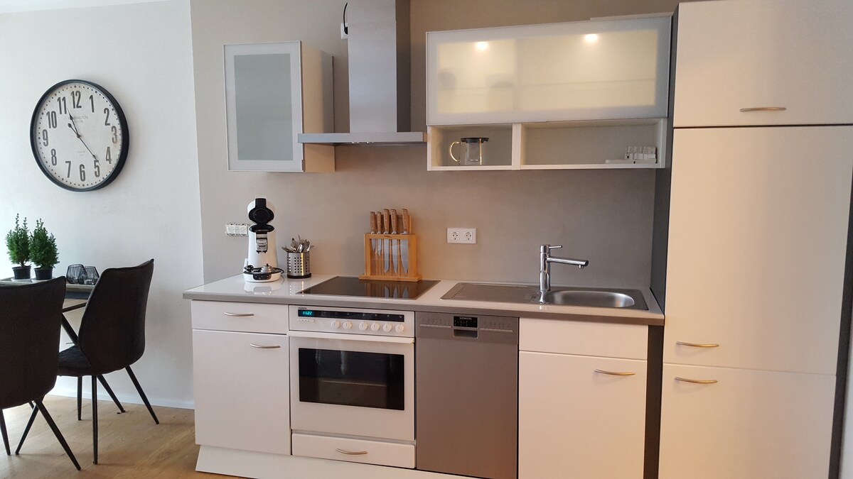 Apartment on the first floor with separate entrance and private terrace. Our facility is decorated in modern and country house style. You have a fully equipped kitchen with cooking island, a large bathroom with walk-in shower. In the apartment is a large bedroom with a double bed in the size 180/200. In addition, in the area of the living room, there is a pull-out couch with the dimensions 140/200. All our beds are equipped with toppers. Towels on site.