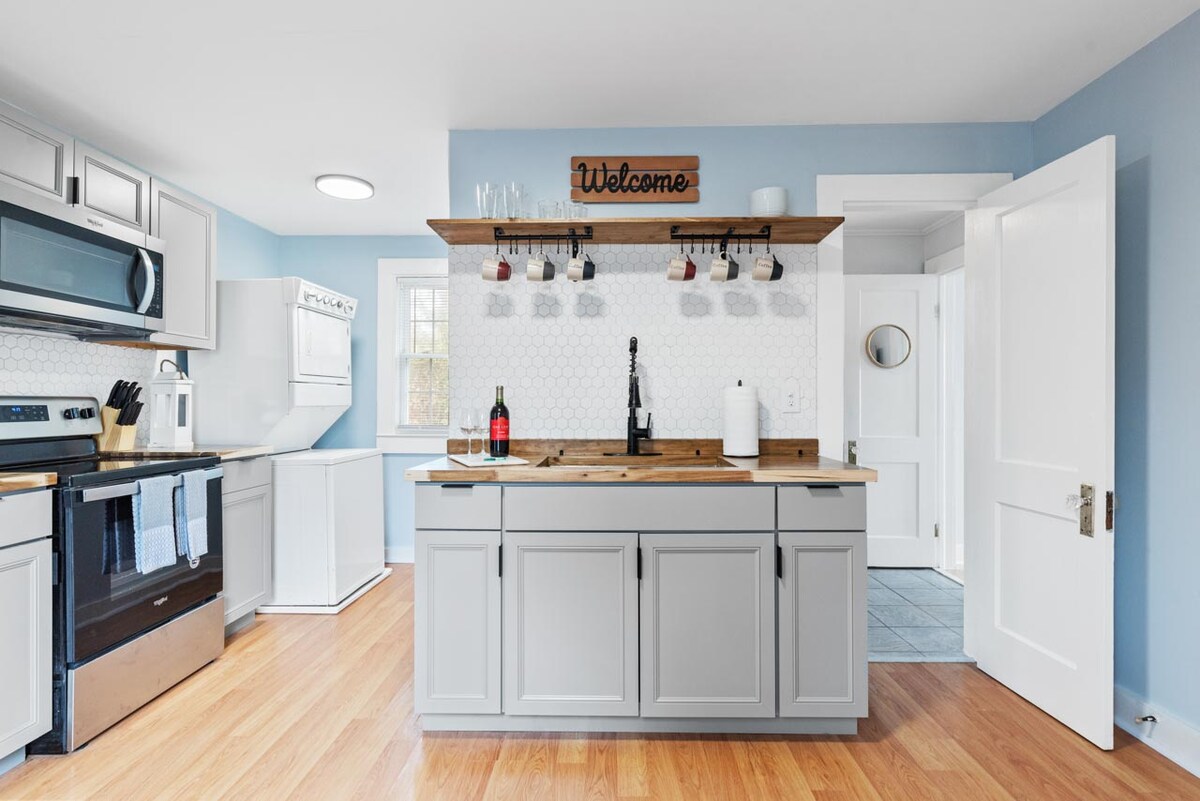 A MUST SEE 5-STAR BUNGALOW! This stylish space is newly rennovated. New appliances, flooring, kitchen and furniture. It is less that 100ft from shops, restaurants, and bars in Historic downtown Apex. You will not find a better location! This space boasts a BOHO/Mid Centry Modern design. WASHER and DRYER included in unit. TWO Amazon SMART TV's with various streaming services. Sleeps 3 adults or 2 adults and 2 children on fold out couch.