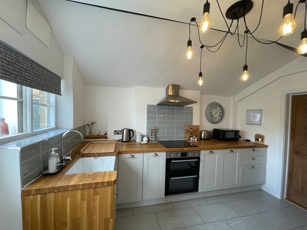 The Garden Flat is an independent new extension to our converted stone barn in Oxfordshire, just outside Hook Norton on the edge of The Cotswolds with stunning views from every window. Attractively & tastefully furnished with a small kitchenette area, 2 ring hob, fridge/freezer, dishwasher, microwave, toaster & kettle - NO OVEN; double bedroom with king size bed & en-suite shower/bathroom. A large patio area with barbecue with table & chairs and stunning views across the valley & sunsets.