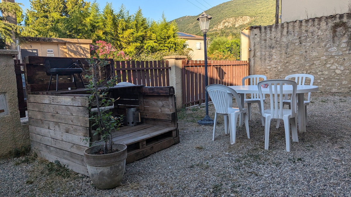 35 m2, 2 rooms in the heart of the village of St-Jean en Royans, in an island of greenery and calm. Perfect base from which to leave the car and enjoy all amenities on foot, but also to explore the Vercors Regional Natural Park. Independent entrance. Not overlooked. Closed and secure parking ideal for motorcycles and bikes. Backyard with small outdoor seating Amenities: - TV, Wi-Fi - double bed 140 new bedding - Bathroom with shower - Baby equipment - Senseo coffee machine