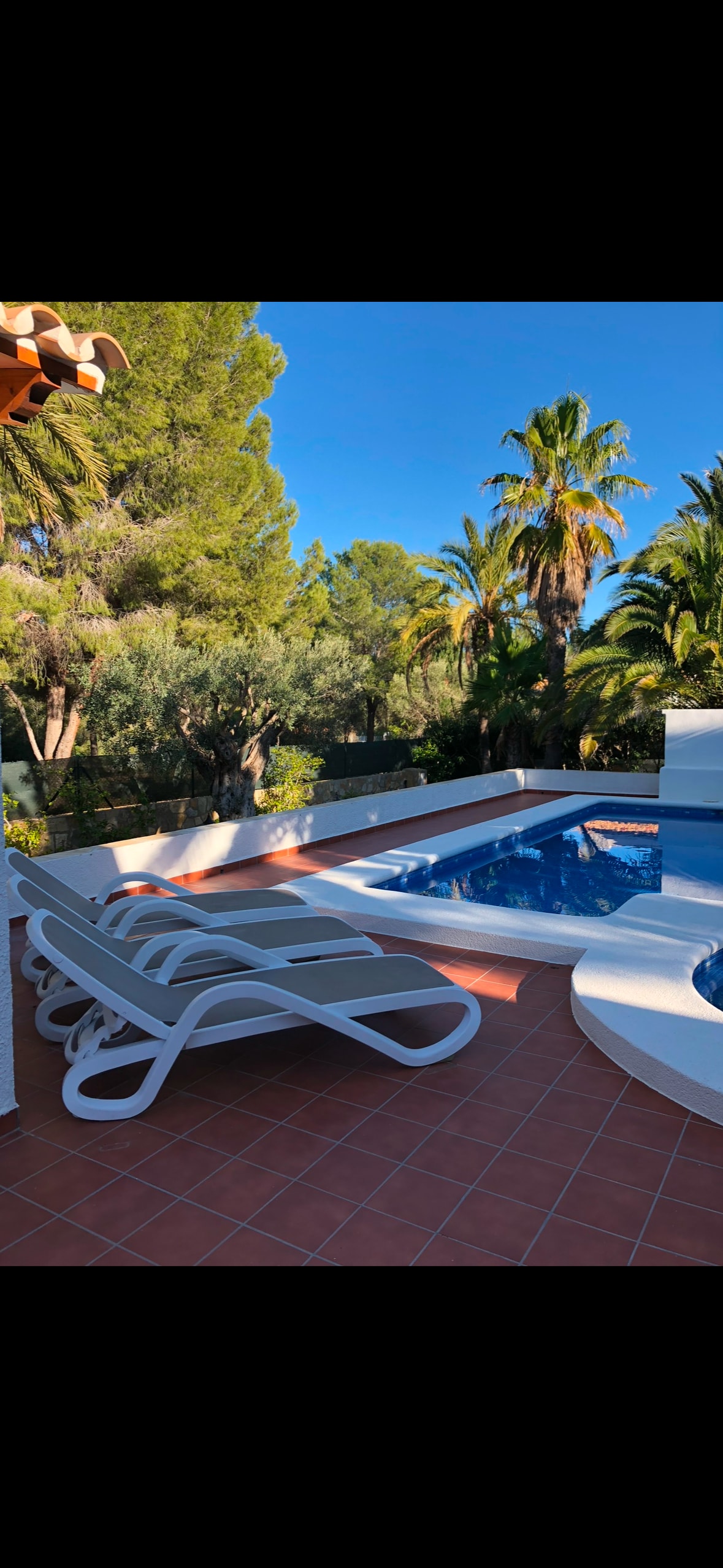 Very private house in quiet area at the foot of the Montgó. Air conditioning and heating throughout the house. Pool of 13'5x 4'5mts and Jacutzzi. Heated swimming pool (ask for price). Sun all day. 1 minute walk to a private clinic, supermarket,cafeteria and 10 mts walking to restaurants. A 5-minute drive to the historic centre and a 15-minute drive to Puerto Beach, where you will find traditional shops and restaurants. 5 beds, 1 queen-size bed, 2 bathrooms, Huge terrace.